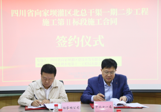 2023年10月25日,四川省向家壩灌區北總干渠一期二步工程施工第Ⅱ標段施工合同、監理第Ⅰ標段監理合同簽約儀式在向家壩公司順利舉行。向家壩公司黨委副書記、副董事長、總經理羅衡分別與中國水利水電第十一工程局有限公司法定代表人、總經理朱曉明,河南明珠工程管理有限公司黨委書記、董事長于維峰進行現場簽約。公司相關領導及部門、施工單位、監理單位、法律顧問等相關人員出席簽約儀式。