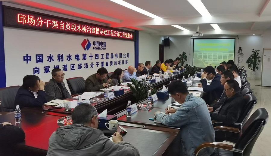 2023年11月29日,向家壩灌區北總干渠一期一步工程邱場分干渠自貢標木橋溝渡槽基礎工程分部工程驗收會在中國水利水電第十四工程局項目經理部會議室(富順板橋)順利召開。木橋溝渡槽基礎工程是向家壩灌區北總干渠一期一步工程第一個組織驗收的分部工程,特邀四川省水利廳質量與安全中心站參會指導,一期一步工程其余各參建施工和監理單位參會交流觀摩。