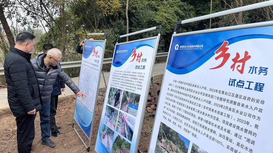 尹曉東一行首先前往青白江水業(yè)公司鄉(xiāng)村水務試點工程點位,查看了高位水池、加壓站運維及自來水到組到戶情況。