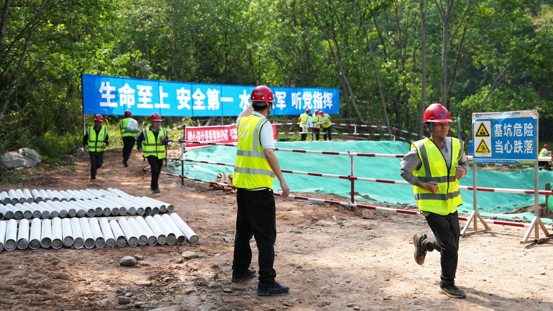 上午9時30分,隨著總指揮一聲令下,防汛安全綜合應急演練正式拉開序幕。本次演練模擬構溪河上游強降雨出現超標洪水,導致跨河渡槽施工出現險情,演練緊扣風險預警、人員設備撤離、圍堰防滲緊急搶險、邊坡險情應急處置、火災救援、心肺復舒救治等六個關鍵場景,重點檢驗了工程建設中應對突發事件的預警、響應、保障及救援能力。