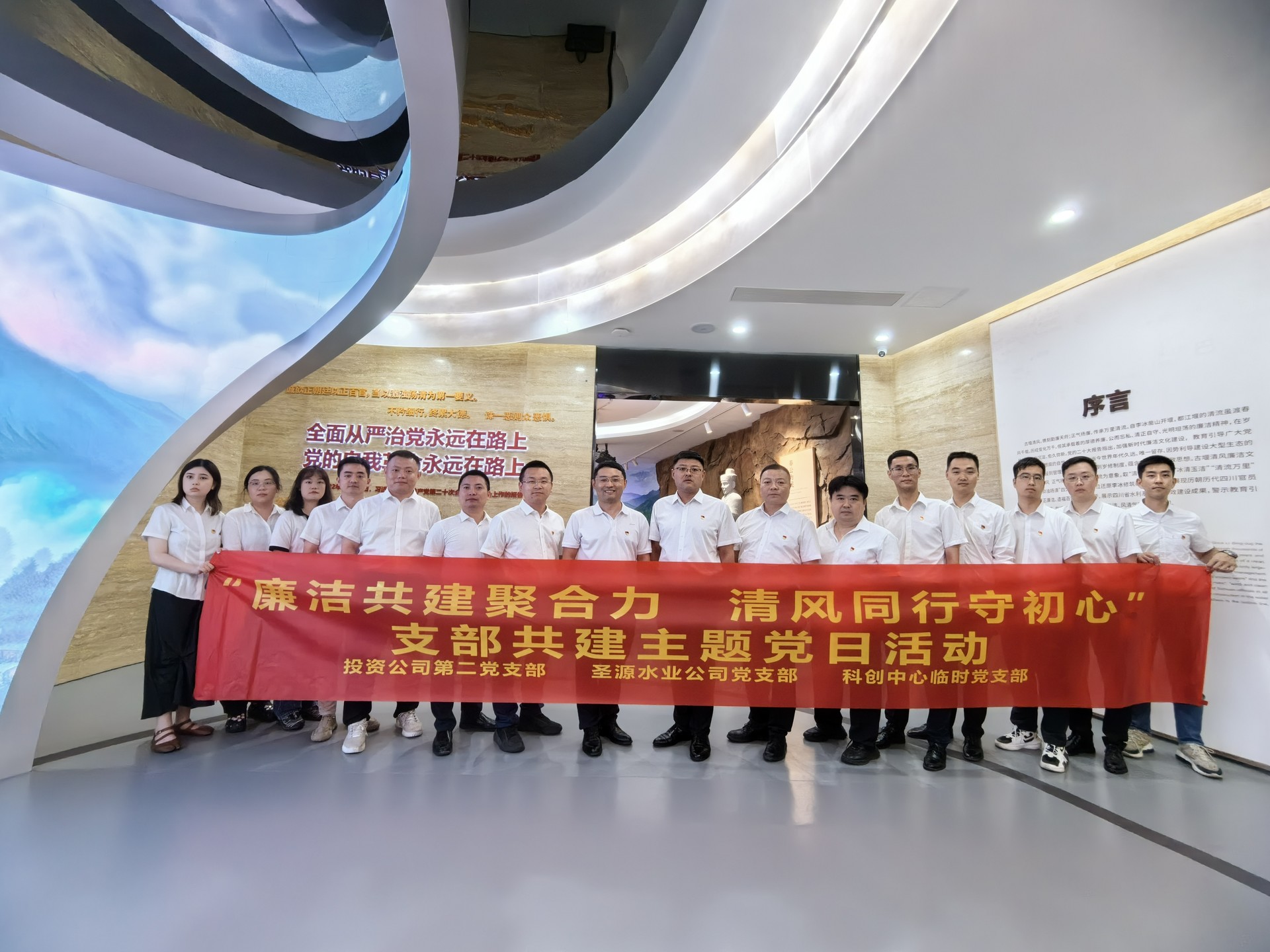 為落實(shí)公司黨委關(guān)于開(kāi)展基層黨組織結(jié)對(duì)共建活動(dòng)的有關(guān)要求,共同促進(jìn)黨紀(jì)學(xué)習(xí)教育聯(lián)學(xué)共進(jìn),6月27日,投資公司第二黨支部、圣源水業(yè)公司黨支部、科創(chuàng)中心臨時(shí)黨支部帶領(lǐng)全體黨員赴四川省都江堰水利發(fā)展中心“古堰清風(fēng)”廉潔文化館開(kāi)展主題黨日活動(dòng)。