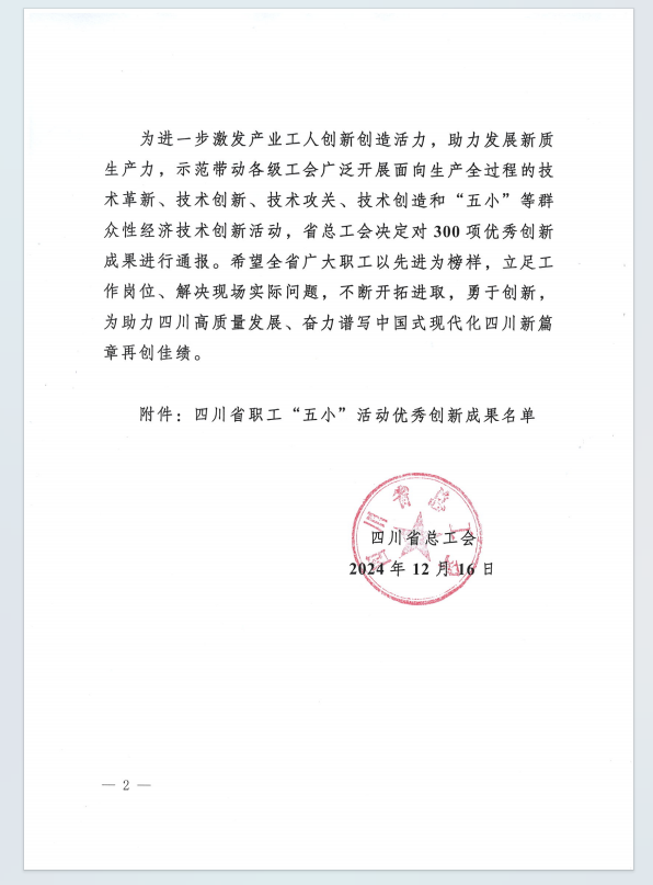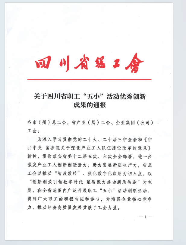 喜報!集團設計公司項目在四川省職工“五小”活動中獲優秀創新成果